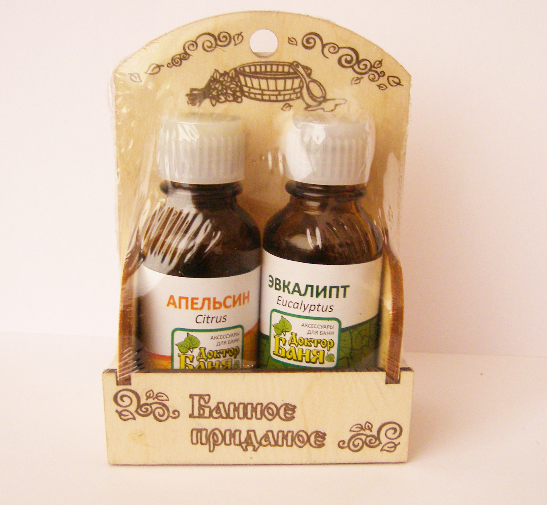 Подарочный набор натуральных эфирных масел для бани в специальной деревянной полочке. Яркие бодрящие и освежающие ароматы апельсина и эвкалипта помогут восстановить силы после трудового дня, забыть о неприятных переживаниях, восстановить эмоциональные и физические силы. Полочка, украшенная узорами создаст дополнительный уют в банном помещении.