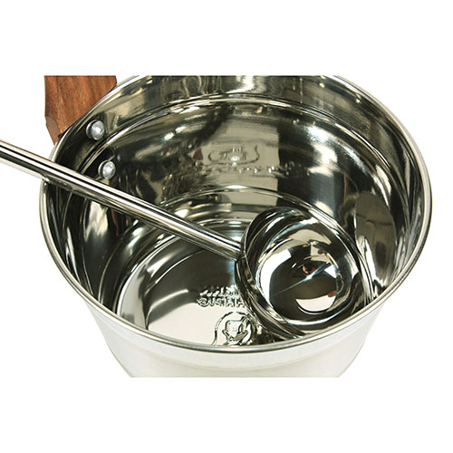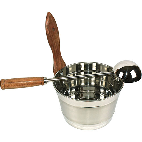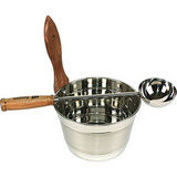 Стильные аксессуары для банных процедур в наборе из двух предметов. Шайка и ковш изготовлены из нержавеющей стали, деревянные ручки покрыты тёмным лаком — такое сочетание цветов и фактур материалов придаёт изделиям стильный внешний вид и элегантность. Нержавеющая сталь не подвержена коррозии, что обеспечит весьма длительный срок службы этих аксессуаров. Шайка может также использоваться в качестве большого черпака для обливания тела. Набор будет отличным выбором для подарка или если вы хотите сэкономить время на покупке банных аксессуаров — в качестве готового решения.