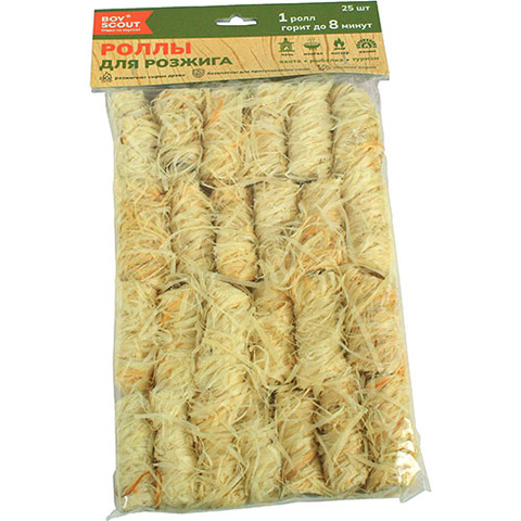 Роллы мгновенно воспламеняются, не дают дыма и неприятного запаха. Для розжига печи, камина, мангала достаточно положить один-два ролла под дрова или древесные угли. Их горение продолжается в течение 8 минут, чего вполне достаточно для розжига сухого топлива. При выезде на пикник или рыбалку роллы помогут вам сэкономить время на розжиге и сделают отдых более комфортным. Из-за их легкости и компактности их всегда удобно взять с собой.