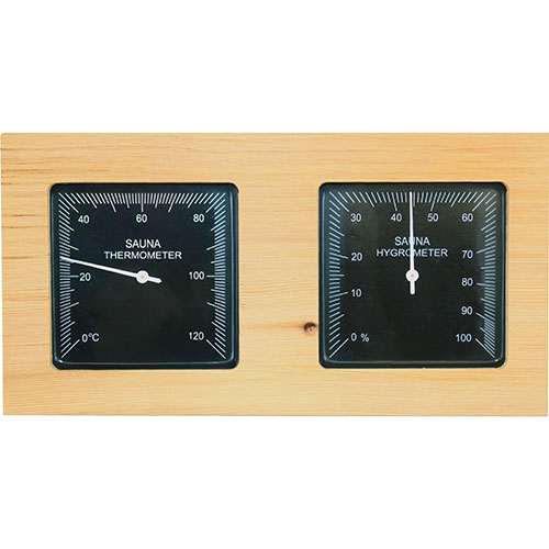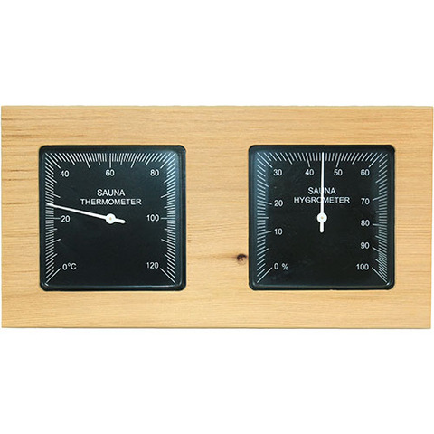 Термогигрометр в корпусе из канадского кедра представляет собой эталон надёжности и функциональности для современной парной. Натуральная древесина кедра при нагревании выделяет целебные фитонциды, создавая в помещении здоровую атмосферу и наполняя её благородным хвойным ароматом. Горизонтальное расположение двух раздельных чёрных циферблатов с контрастными белыми стрелками и шкалами позволяет максимально удобно и быстро считывать показатели температуры и влажности даже в условиях густого пара.